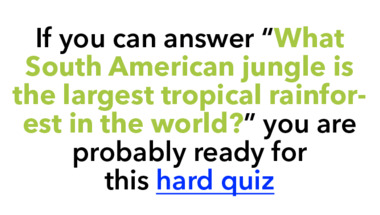 In this fun trivia quiz we're going to ask questions like "What South American jungle is the largest tropical rainforest in the world?" and "What complex serves as the official residence of the President of the Russian Federat..".
