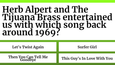 4/10 is what people on average are scoring in this 1960s Songs quiz so far. Are you ready to answer questions like "Herb Alpert and The Tijuana Brass entertained us with which song back around 1969?" and "Sgt. Barry Sadler entertained us with which song back around 1967?"