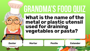 6/10 is what people on average are scoring in this trivia quiz so far. Are you ready to answer questions like "What is the name of the metal or plastic utensil used for draining vegetables or past.." and "A sauce made from which fruit is often served with pork?"