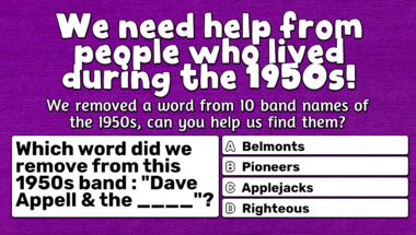 6/10 is the score to beat in this trivia quiz to put yourself over the average quiz taker. But you're probably going to be able to answer questions "Which word did we remove from this 1950s band : "The ____ Aces"?" and "Which word did we remove from this 1950s band : "The El ____"?" easy!