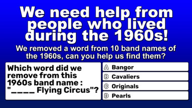 In this fun 1960s bands with a missing word quiz we're going to ask questions like "Which word did we remove from this 1960s band name : "Bill Haley & His ____"?" and "Which word did we remove from this 1960s band name : "The ____ Who"?".